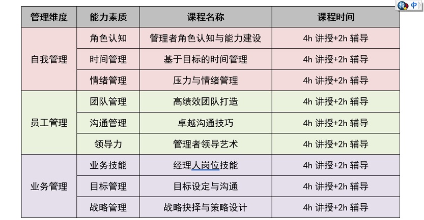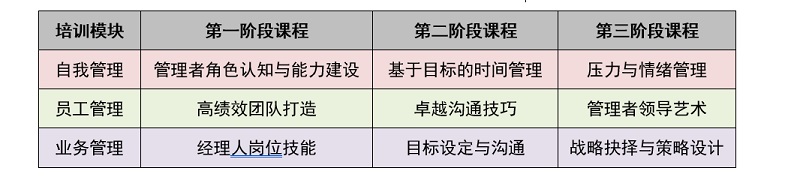 2、課程設(shè)置中高層管理者培訓(xùn)集中在“自我管理”、“員工管理”、“業(yè)務(wù)管理”三個維度,每個管理維度都有相對應(yīng)的能力素質(zhì)模塊,據(jù)此設(shè)置針對性課程,具體見表1-3。